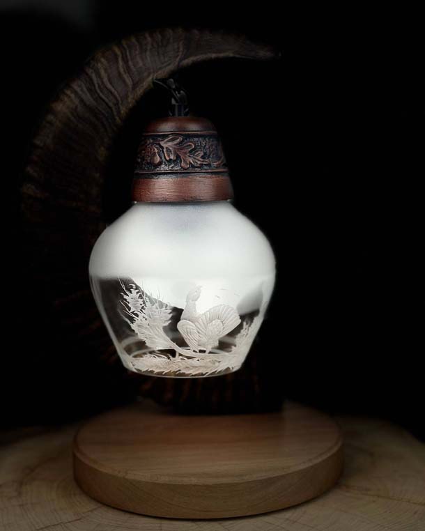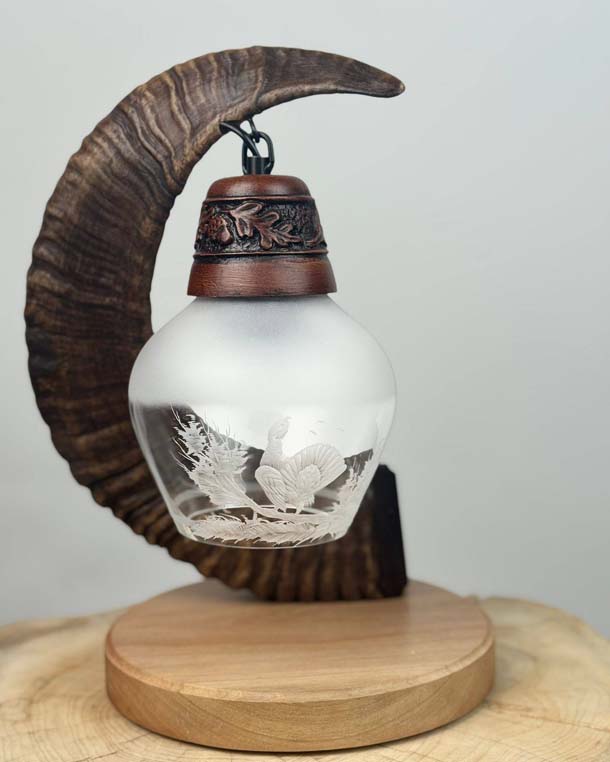 Povýšte svoj interiér na novú úroveň s touto nádhernou poľovníckou stolnou lampou! Svietidlo je zavesené na muflonej tuľajke, ktorá spočíva na drevenej podstave. Jedinečné tienidlo zdobia precízne gravírované poľovnícke motívy, ktoré vytvárajú nezameniteľnú atmosféru.