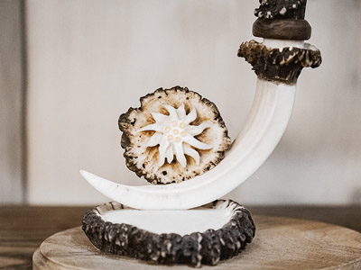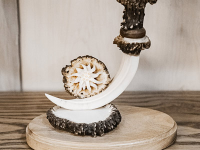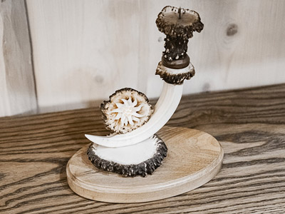 Oživte svoj priestor jedinečným umením! Tento svietnik z diviačieho kla je zdobený precíznou rezbou v ružici z jeleňa, je vyrobený ručne zo 100% prírodných materiálov. Každý kúsok je originál, ktorý prináša kúzlo prírody do vášho domova. Perfektný doplnok pre milovníkov poľovníckej estetiky!