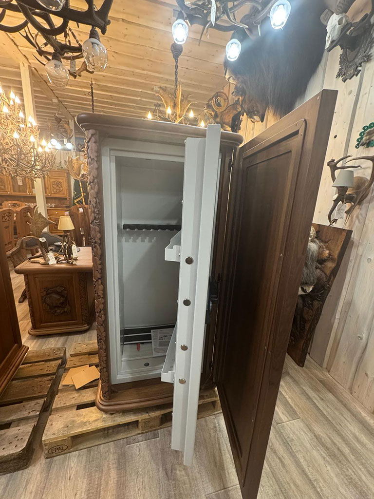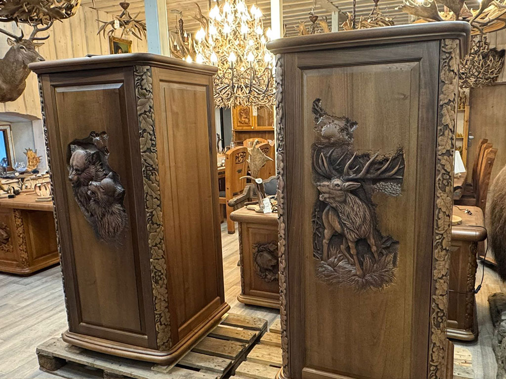 Celá vonkajšia skriňa je ručná práca, hrúbka materiálu 35 mm. Trezory vieme vyrobiť v rôznych veľkostiach, z rôznych druhov dreva a s motívmi podľa vášho výberu.Cena: 9950 €