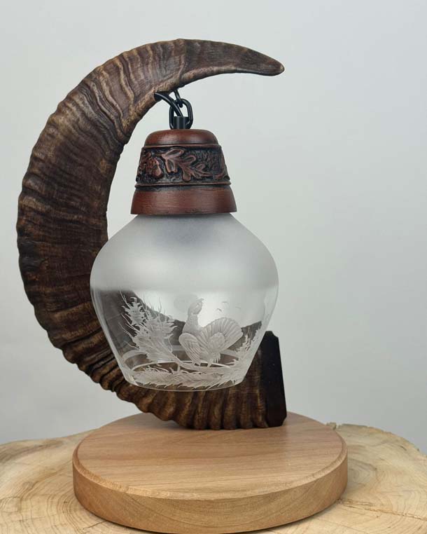 Povýšte svoj interiér na novú úroveň s touto nádhernou poľovníckou stolnou lampou! Svietidlo je zavesené na muflonej tuľajke, ktorá spočíva na drevenej podstave. Jedinečné tienidlo zdobia precízne gravírované poľovnícke motívy, ktoré vytvárajú nezameniteľnú atmosféru.