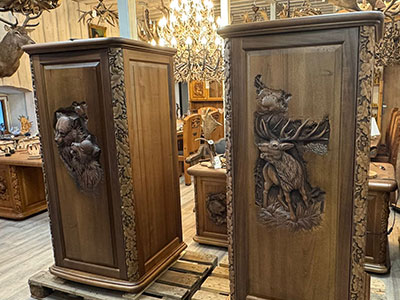 Celá vonkajšia skriňa je ručná práca, hrúbka materiálu 35 mm. Trezory vieme vyrobiť v rôznych veľkostiach, z rôznych druhov dreva a s motívmi podľa vášho výberu.Cena: 9950 €